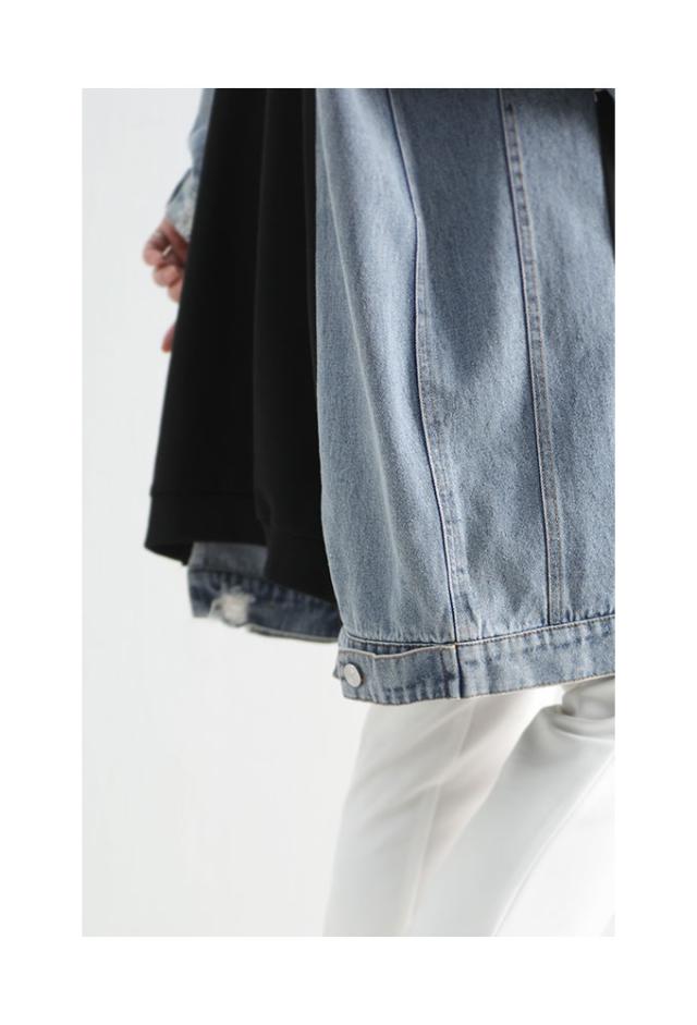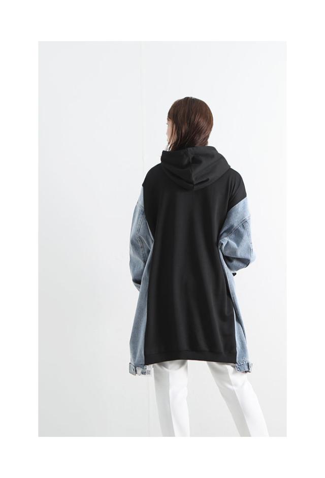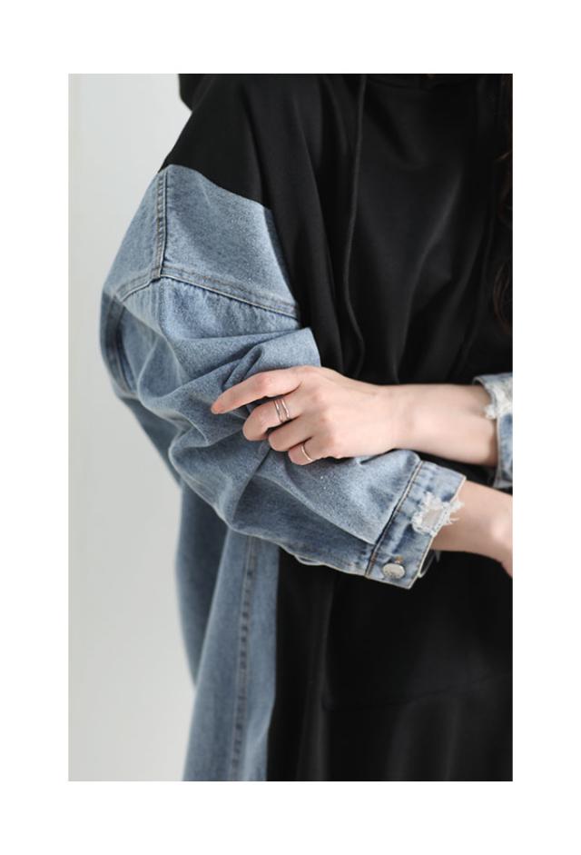 着丈は膝ぐらいまであるいます。袖丈は手の甲が隠れるぐらいです。デニム柄で全体的にゆったりとしたラインです。フードがついており頭が被れて全体はデニムとブラックのツートンカラーになっています。