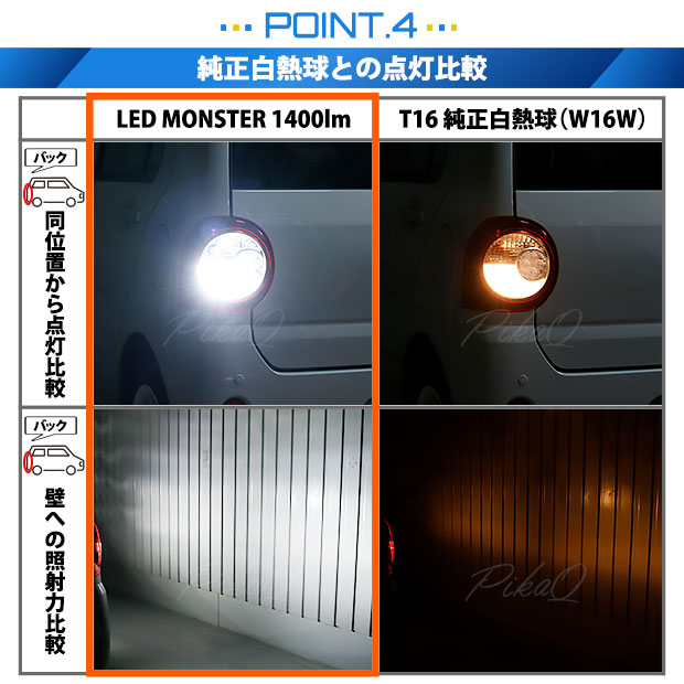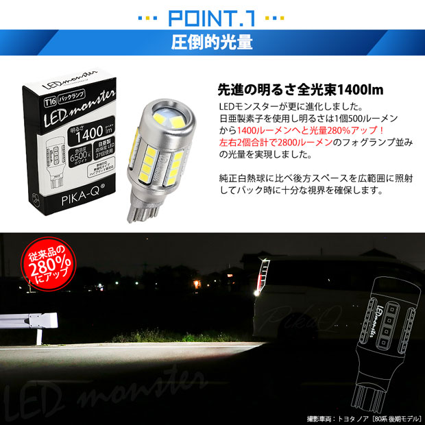 前モデルの500ルーメンから明るさ280%にアップ!ピカキュウ史上最強のT16 LEDバックランプバルブ LED monster 1400ルーメンが登場です。