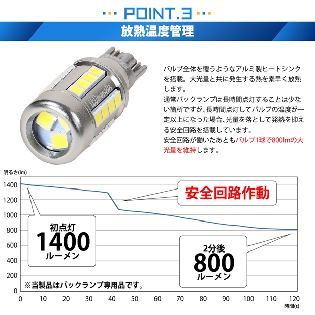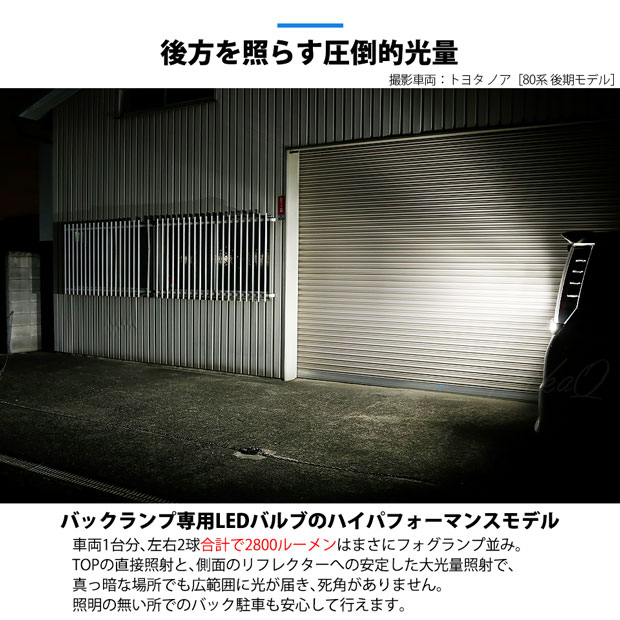 左右合わせて全光束2800ルーメンのフォグランプ並みの明るさのバックランプ(後退灯)専用LEDバルブです。 日本国内のLED素子メーカー日亜化学工業の3030LED素子を使用し、脅威的な明るさと高品質の両立を実現。