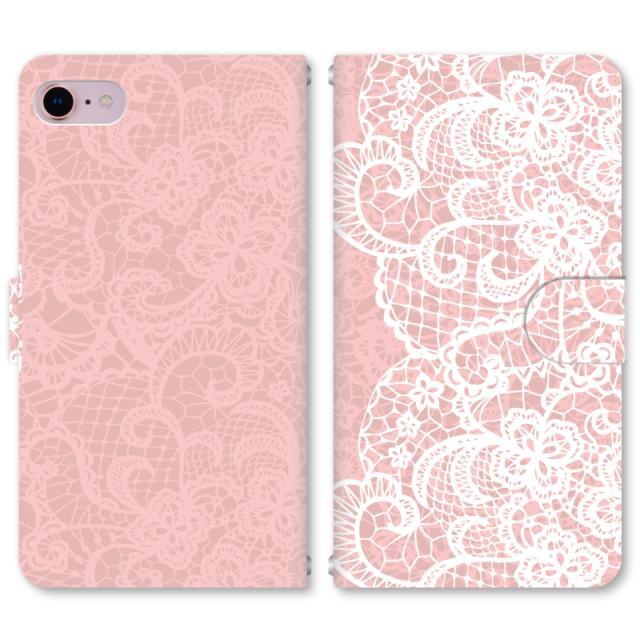 スマホケース 手帳型 iPhone13 iPhoneSE2 アイフォン 8 aquos sense GooglePixel xperia galaxyなど多機種制作対応 m3117_白レース ピンクB