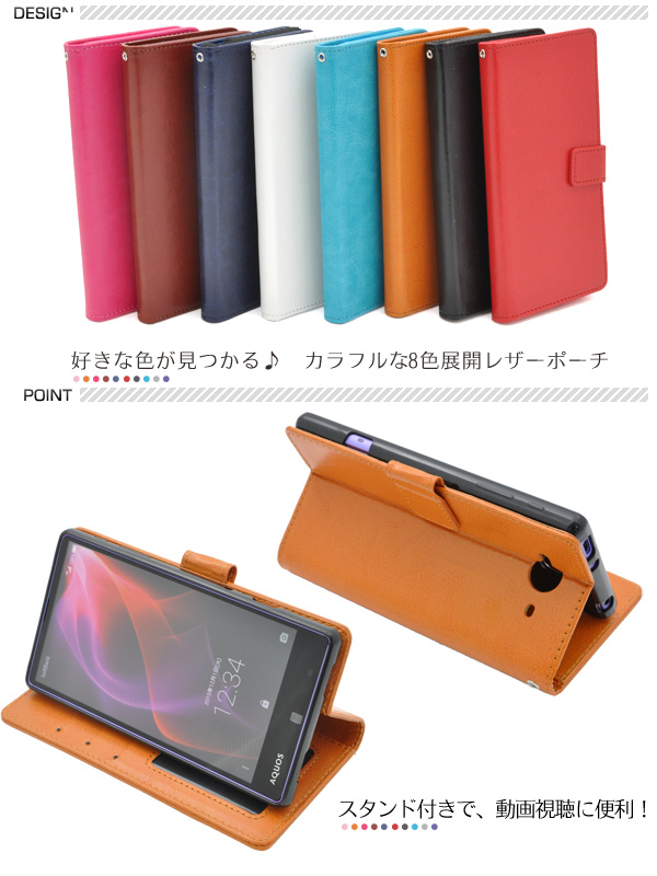 | カラフルな8色展開のAQUOS ZETA SH-01H/AQUOS Xx2 502SH用カラーレザースタンドケースポーチ。 衝撃やキズなどからスマートフォンを守ります。 また、内部はソフトケースなので着脱が簡単です。 背面を折り返すとスタンドとして使用できるので、動画視聴に便利です。 落下防止に最適なストラップとストラップホール付きです。 横開きタイプなので、手帳のように使うことができます。 また、内側に3つのカードポケットとサイドポケットが付いています。 ※AQUOS ZETA SH-01H/AQUOS Xx2 502SHは付属しません。 ※ライセンス商品ではありません。※カードは付属しません。 ※指紋認証穴は開いていません。 | ||||||||||