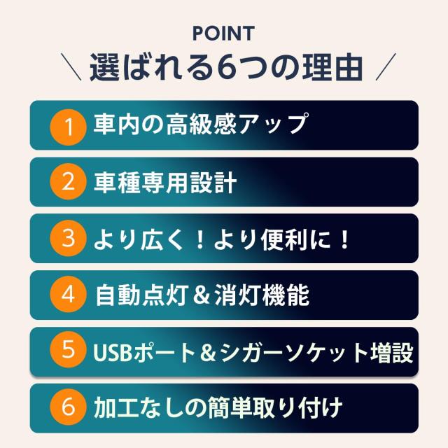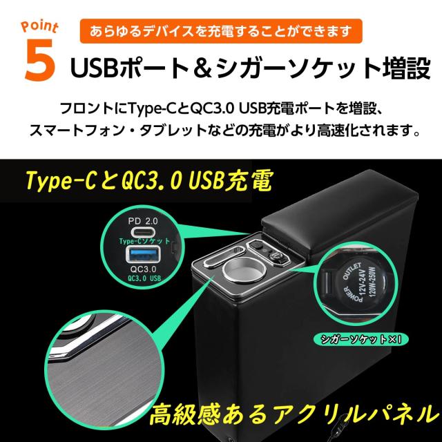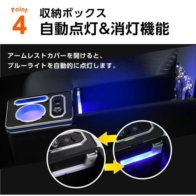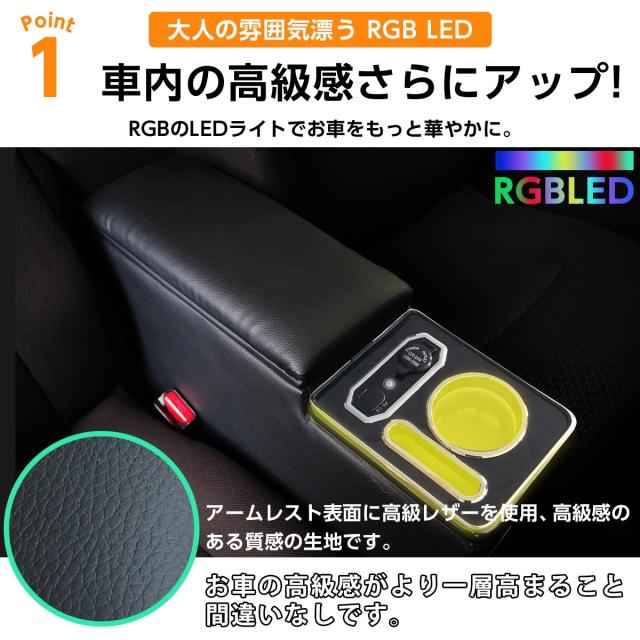 ・コンソールボックスの表面は上質なレザー(合成合皮)を使用。摩擦に強く、汚れがつきにくいです。内側にソフトな素材を使用しているので騒音を軽減できます。コンソールボックス内部にLEDが付属し車内を煌びやかに演出します。