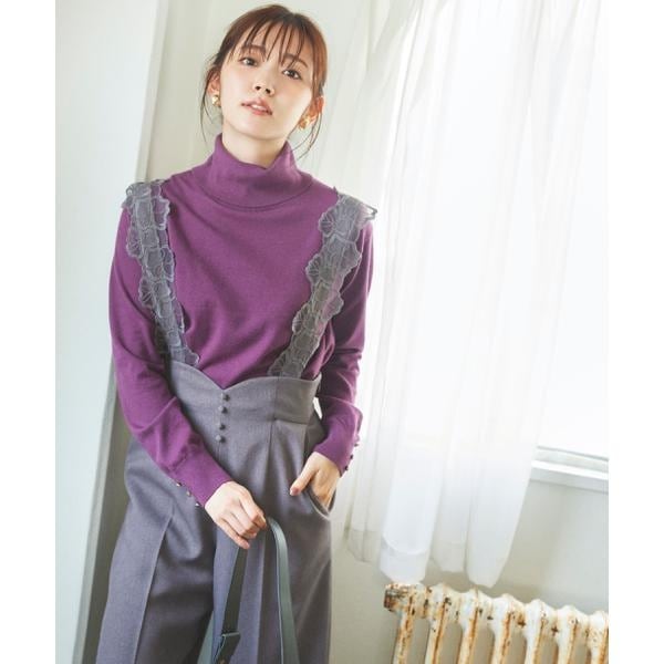 【商品特徴】体のラインを拾いすぎない天竺編みのハイネックニットトップスです。今季らしいハイネックデザインであたたかみを感じられます。袖口にあしらったツヤ感あるメタル釦も可愛いポイントになります。通勤にも休日にもキレイめな雰囲気で着回しできます。【スタイリング】無地やチェック柄、花柄スカート合わせから、ジャンパースカートとレイヤードにもオススメです。