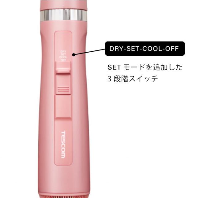 どなたにも使いやすいスライド式の切り替えスイッチ。温風は、しっかり乾かす「DRY」と髪が広がりにくい「SET」の2段階。セットの仕上げに冷風の「COOL」とスタイリングしながら温度を簡単に切り替え可能です。