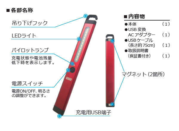 | 内容物 | ・本体(1) ・USB変換ACアダプター(1) ・USBケーブル(長さ約75cm) (1) ・取扱説明書(保証書付き) (1) ※ ( )内は数量です。 |