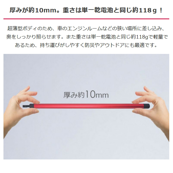 - 単一乾電池と同じ約118gの軽量で持ち運びしやすい。
