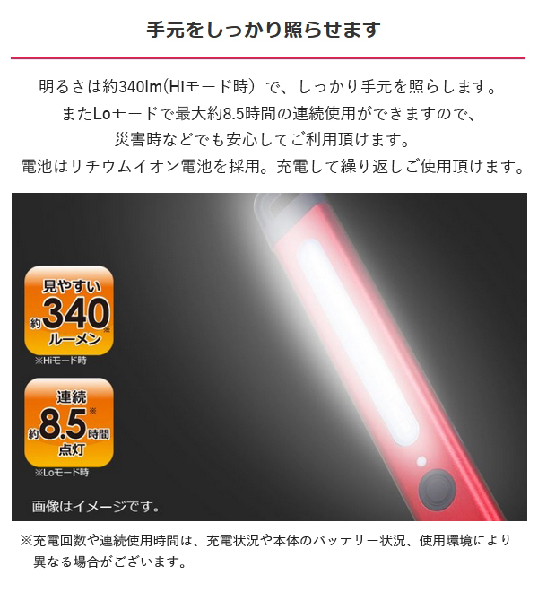 - 明るさは手元作業などに十分な340ml(ルーメン)。