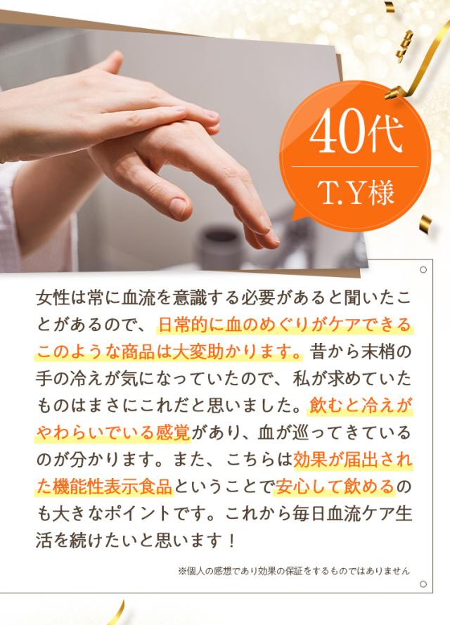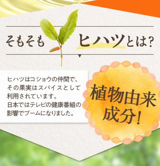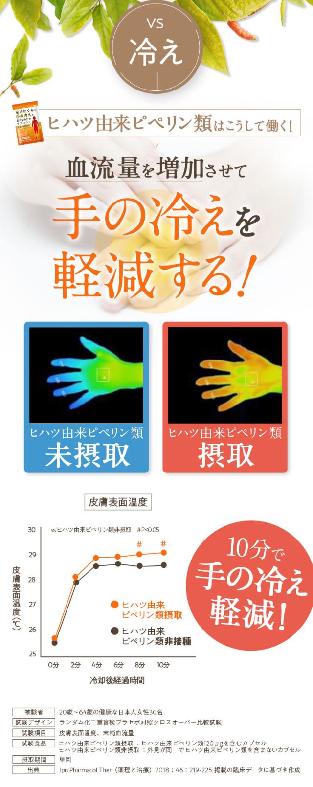 【届出表示】本品にはヒハツ由来ピペリン類が含まれます。ヒハツ由来ピペリン類は、脚のむくみが気になる健常な女性の夕方の脚のむくみ(病的ではない一過性のむくみ)を軽減する機能があることが報告されています。また、冷えにより低下した血流(末梢血流)を正常に整え、冷えによる末梢(手)の皮膚表面温度の低下を軽減する機能があることが報告されています。届出番号:G104