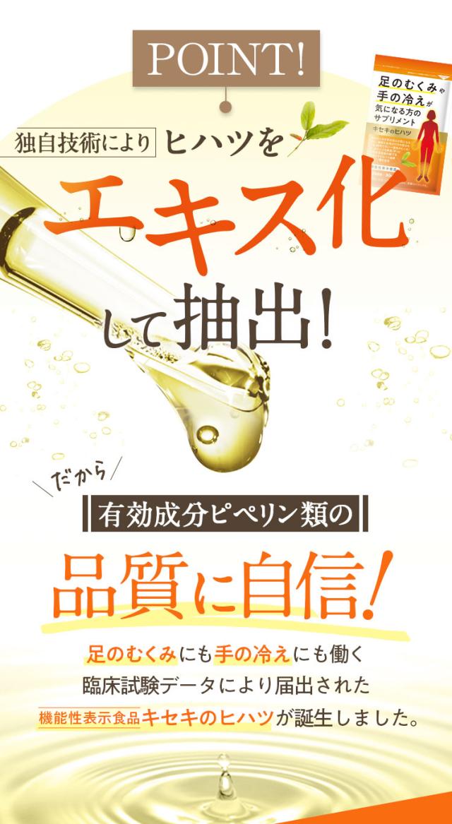 キセキのヒハツは臨床データにより足のむくみや手の冷えを軽減する作用が認められている機能性表示食品です。