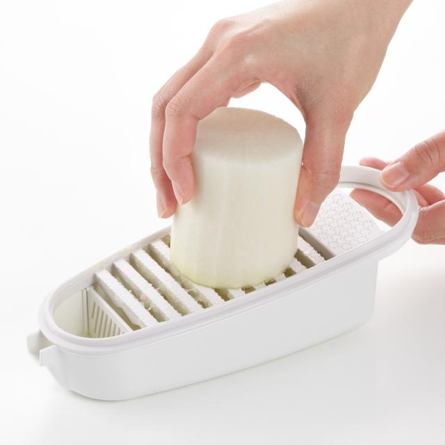 | 材質 | おろし器:ABS樹脂(耐熱温度80度) 容器・水切り用仕切り:ポリプロピレン(耐熱温度110度) 滑り止め部:シリコーンゴム |