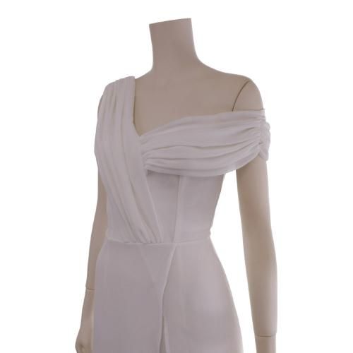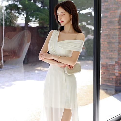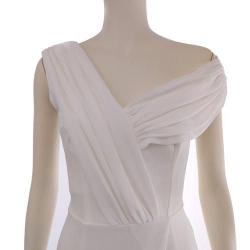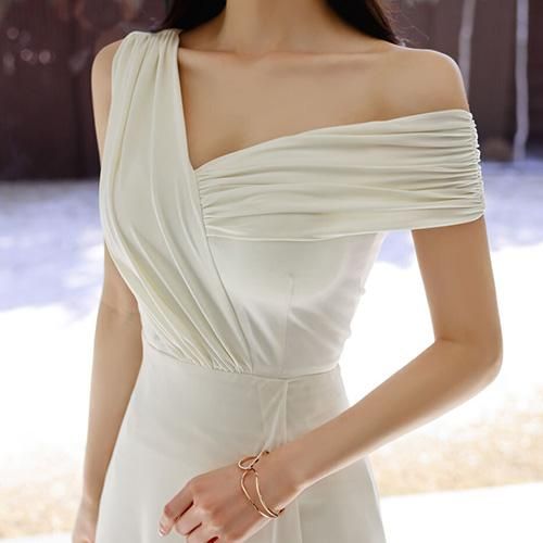 ワンショルダーにして鎖骨と肩のラインの美しさを強調。
