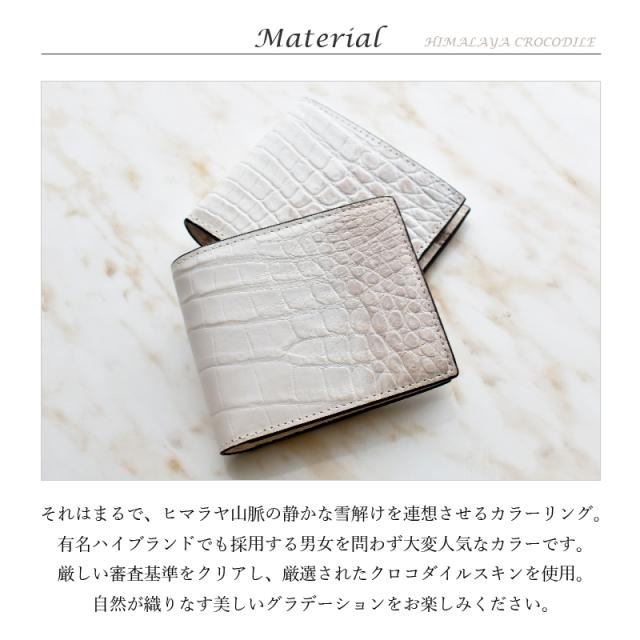 | 特徴 | point.1それはまるで、ヒマラヤ山脈の静かな雪解けを連想させるカラーリング。有名ハイブランドでも採用する男女を問わず大変人気なカラーです。厳しい審査基準をクリアし、厳選されたクロコダイルスキンを使用。自然が織りなす美しいグラデーションをお楽しみください。 point.2当店のクロコダイルは本革を使用しております。天然素材の為、斑模様が全く同じものはありません。また、斑模様を指定してのご注文は承っておりません。世界に一点、あなただけのクロコダイルがお手元に届くまでお楽しみにお待ちください。 point.3地にお腹を擦りながら歩くワニの体には、傷やしわが付き物です。まったく傷が付かない事は無いと言っても過言ではありません。これは、ワニがたくましく生きた証です。それぞれの個性を楽しみ、大切にすることで、愛着が湧き、より経年変化を楽しむ事が出来ます。 |