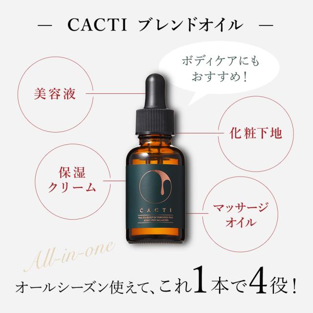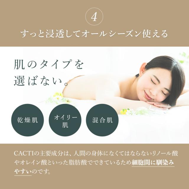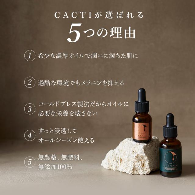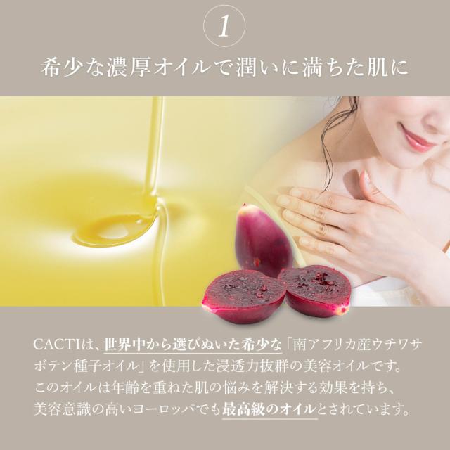 CACTIは、世界中から選びぬいた希少な「南アフリカ産ウチワサボテン種子オイル」を使用した浸透力抜群の美容オイルです。