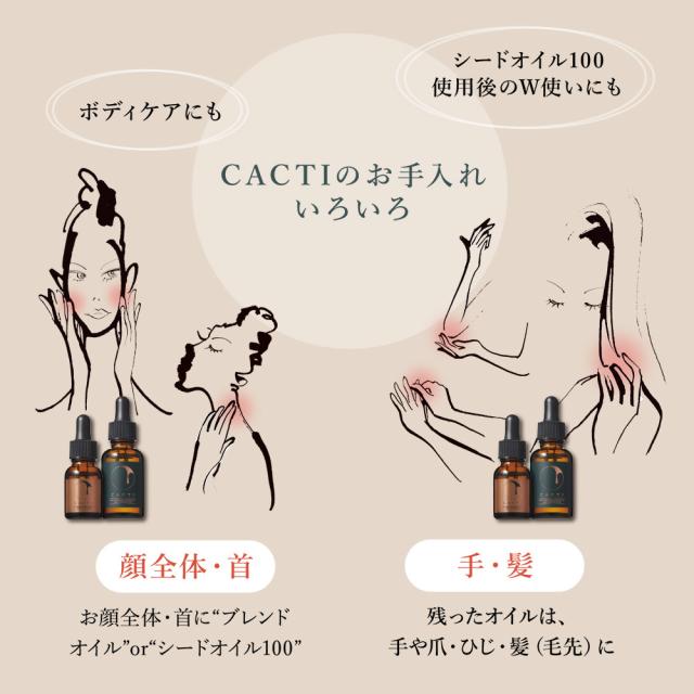 CACTIでは、一番効果の高い100%ウチワサボテン種子オイルだけの“シードオイル100”(※香りづけなし)と、ウチワサボテン種子オイルと相性の良いオイルとブレンドし、天然アロマで香りづけした“ブレンドオイル”の2種をご用意。