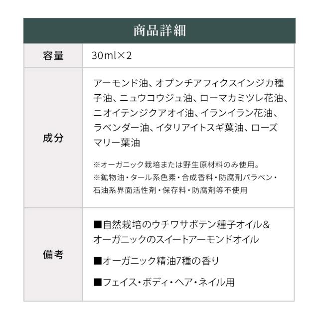 原材料:アーモンド油、オプンチアフィクスインジカ種子油、ニュウコウジュ油、ローマカミツレ花油、ニオイテンジクアオイ油、イランイラン花油、ラベンダー油、イタリアイトスギ葉油、ローズマリー葉油