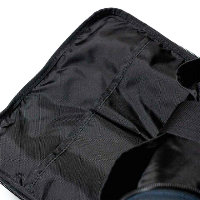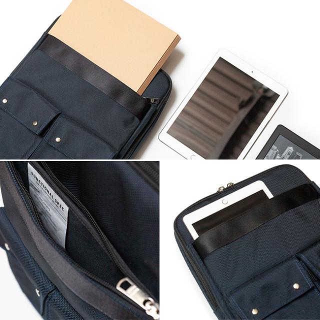 メイン収納部とは別に、本体前面に12.9inchサイズのiPad proが入るサイズの大型ポケットを完備。内装はスエード調のマイクロファイバー素材を採用し、デバイスを傷から守ります。