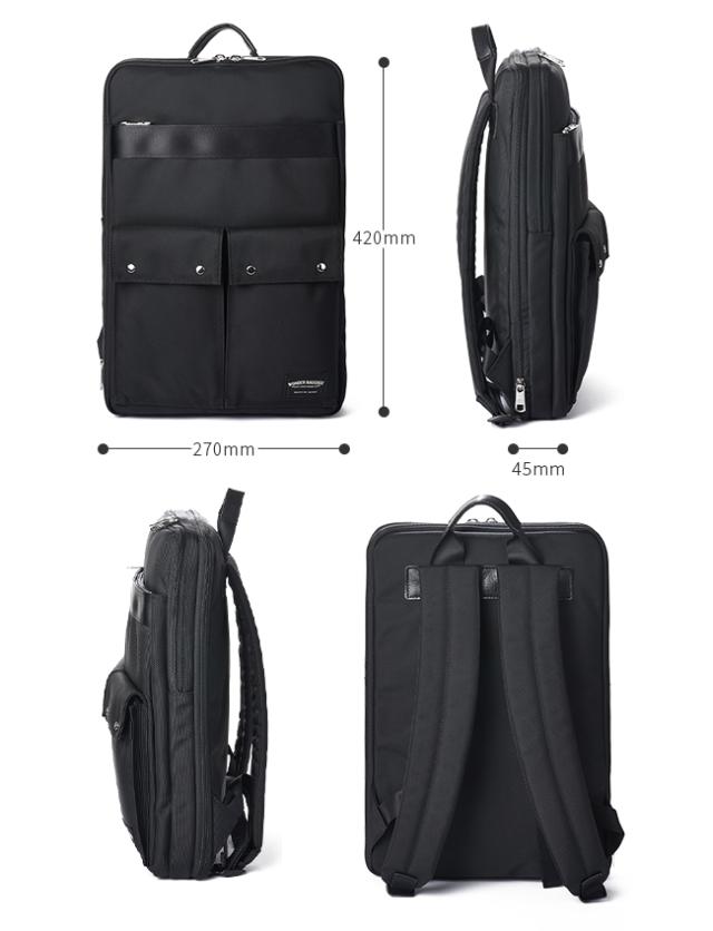 | ブランド |ワンダーバゲージ / WONDER BAGGAGE シリーズ |グッドマンズ/ GOODMANS 商品名 |DEVICE SACK 品番 |wb-g-029 形状 |ビジネスリュックB4 / エクスパンダブル(拡張)機能 外寸 |W270×H420×D45[mm] 重量 |約 1050g 収納サイズ |B4用紙サイズ 素材 |バリスターナイロン |