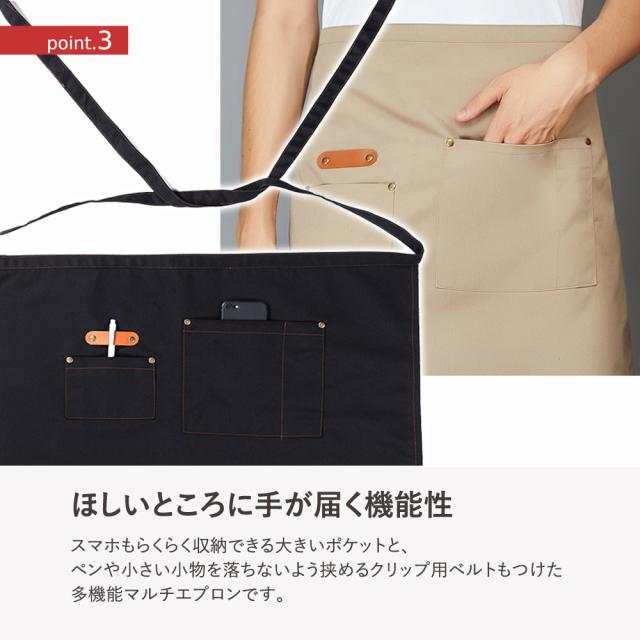 スマホもらくらく収納できる大きいポケットと、ペンや小さい小物を落ちないよう挟めるクリップ用ベルトもつけた多機能マルチエプロンです。