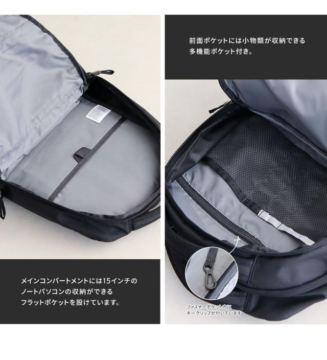 メインコンパートメントには15インチのノートパソコンの収納ができるフラットポケットを設け、前面ポケットには小物類が収納できる多機能ポケット付き。