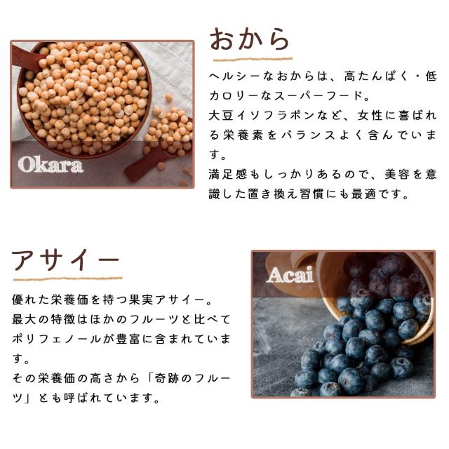 【原材料】水溶性食物繊維、おから末、チアシード、サイリウムハスク末、植物油脂、レッドドラゴンフルーツエキス末、リンゴ果汁末、グルコマンナン、イソマルトオリゴ糖、マキベリー果汁末、アサイー末(マルトデキストリン、アサイー(果肉))、植物発酵エキス末、植物発酵食品(糖類、野菜類(ヨモギ、ウコン、スギナ、ドクダミ、トチュウの葉、クコの実、ハトムギ、アマチャズル、タンポポの根、ツユ草、クマザサ、オトギリソウ、甘草、ツルナ、ハブ草、アマドコロ、イチジク葉、霊芝、その他)、野菜、果物(人参、玉ねぎ、パセリ、ショウガ、リンゴ、ミカン、メロン、グレープ、その他)、海藻類(コンブ、ノリ))、ミネラルイースト、穀物麹(大麦、あわ、ひえ、きび、タカキビ、紫黒米、米粉)、穀物発酵エキス、乾燥野菜混合粉末(大麦若葉、ケール、さつまいも、ほうれんそう、南瓜、人参、桑の葉、大葉)、乳酸菌末(デキストリン、乳酸菌(殺菌))、甘味料(ソルビトール、アスパルテーム・L-フェニルアラニン化合物)、クエン酸、増粘多糖類、香料、卵殻未焼成カルシウム、野菜色素、結晶セルロース、ビタミンC、抽出ビタミンE、ナイアシン、パントテン酸カルシウム、ビタミンB1、ビタミンB6、ビタミンB2、ビタミンA、葉酸、ビタミンD、ビタミンB12(原料の一部に卵、小麦、乳成分、大豆、リンゴ、バナナ、オレンジ、キウイフルーツ、ヤマイモ、ゴマ、カシューナッツを含む)