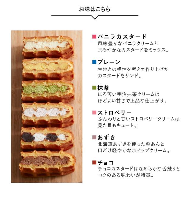 〇ワッフルケーキ6個入(プレーン、バニラカスタード、抹茶、ストロベリー、チョコ、あずき)(1個サイズ:約8cm×3.5cm×2.5cm)