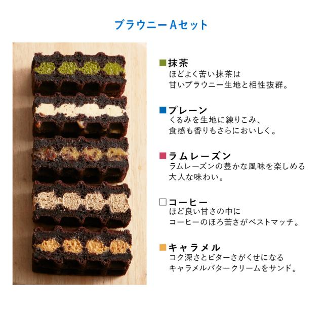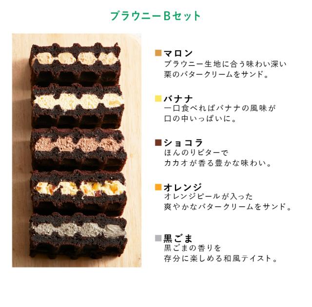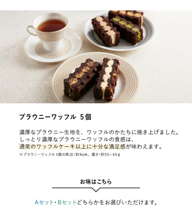 〇ブラウニーワッフル5個入([A]プレーン、キャラメル、ラムレーズン、コーヒー、抹茶)([B]黒ごま、ショコラ、バナナ、オレンジ、マロン)(1個サイズ:約80mm×35mm×35mm)