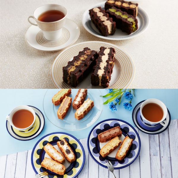 〇ブラウニーワッフル5個入([A]プレーン、キャラメル、ラムレーズン、コーヒー、抹茶)([B]黒ごま、ショコラ、バナナ、オレンジ、マロン)(1個サイズ:約80mm×35mm×35mm)