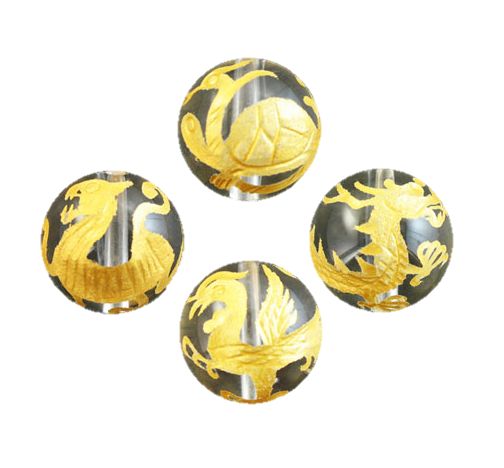 水晶 四神獣(金色入り)手彫り玉セット 彫刻ビーズ 14mm玉 青龍・朱雀・白虎・玄武 天然石 パワーストーン