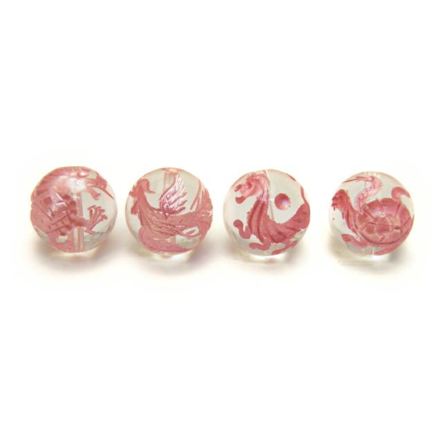 水晶(ピンク色入り)四神獣手彫り玉セット 彫刻ビーズ 12mm玉 青龍・朱雀・白虎・玄武 天然石 パワーストーン