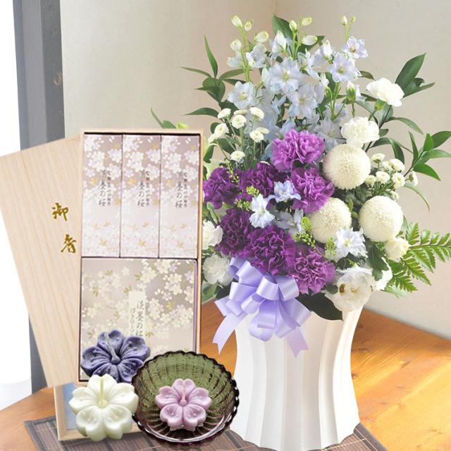 お花とお線香 セット ムーンダスト供花アレンジLサイズと浮きローソク・桜線香セット お花とお線香セット メッセージカード FKAASE