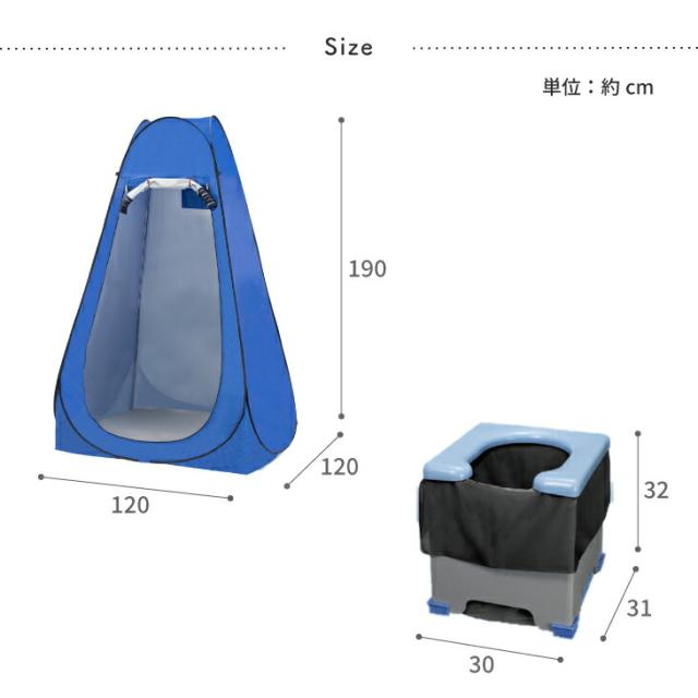 ●サイズ/(テント)使用時:約幅120×奥行120×高さ190cm・収納時:約直径56×高さ4cm、(トイレ)使用時:約幅30×奥行31×高さ32cm・収納時:約34.5×奥行9×高さ34cm