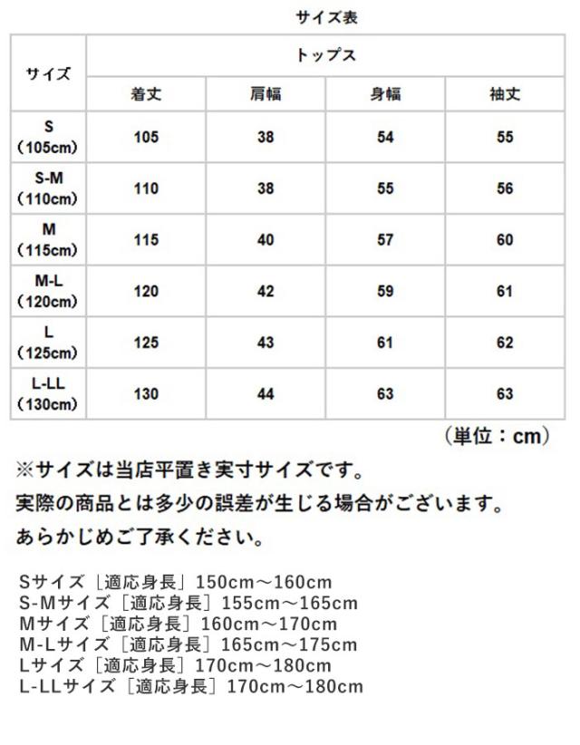 | サイズ | ・Sサイズ(着丈105cm) [適応身長]150cm〜160cm/[適応胸囲]79cm〜87cm ・S−Mサイズ(着丈110cm) [適応身長]155cm〜165cm/[適応胸囲]79cm〜87cm ・Mサイズ(着丈115cm) [適応身長]160cm〜170cm/[適応胸囲]86cm〜94cm ・M−Lサイズ(着丈120cm) [適応身長]165cm〜175cm/[適応胸囲]93cm〜101cm ・Lサイズ(着丈125cm) [適応身長]170cm〜180cm/[適応胸囲]100cm〜108cm ・L−LLサイズ(着丈130cm) [適応身長]170cm〜180cm/[適応胸囲]100cm〜108cm 【収納袋】 [縦]約39cm/[横]約31cm ※サイズについて詳細は、サイズ表をご覧くださいませ。 |