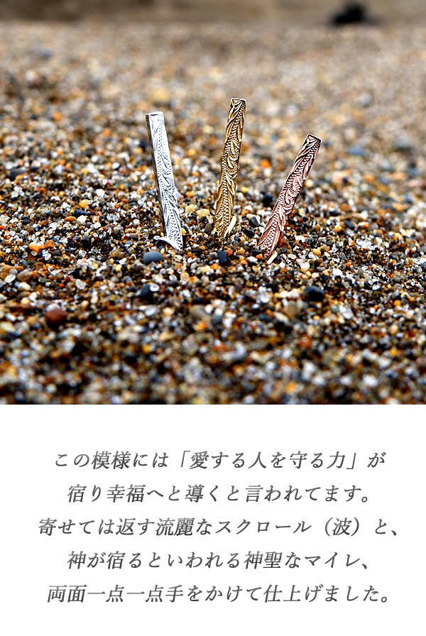 遠い昔からハワイアンジュエリーは人々の大切な想いとともに身に着けられてきました。ただの飾りではなく、その時々の想いそれぞれのあたたかい気持ちを宿っているからこそ放つ本当の輝き、真実。熟年された職人が積み重ねてきた感性で丁寧に彫りこんでいます。