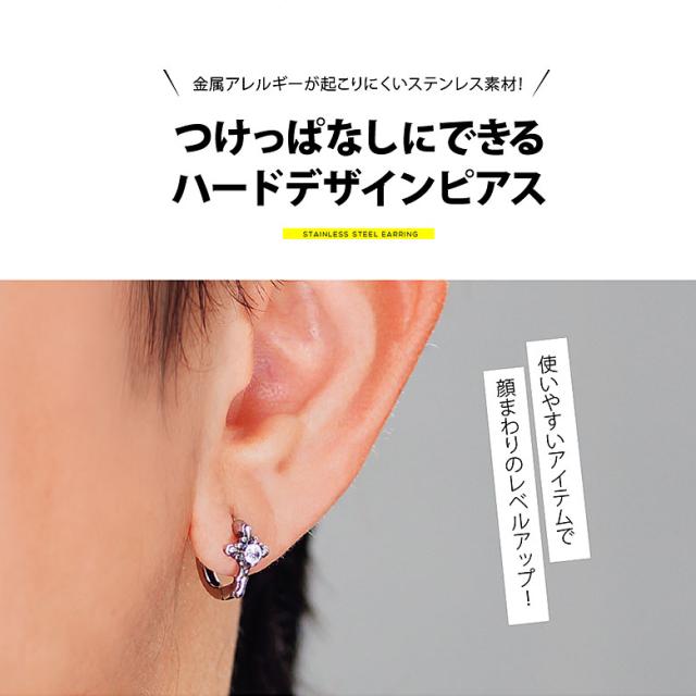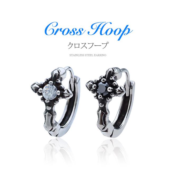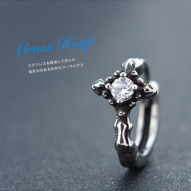 十字架をモチーフにしたステンレス製フープピアスです。ピアスの中央にはダイヤモンドのようにキラッと輝くジルコニアをセット。シルバーアクセサリーのように見えるこのピアスは、ステンレスのキャスト(鋳造)で作られているので、シルバーのような複雑な造形が可能になり、ステンレスの特徴の、傷つきにくい、さびにくい、金属アレルギーを起こしにくく、変色も起こりにくいのでつけっぱなしで使用もできるピアスです!