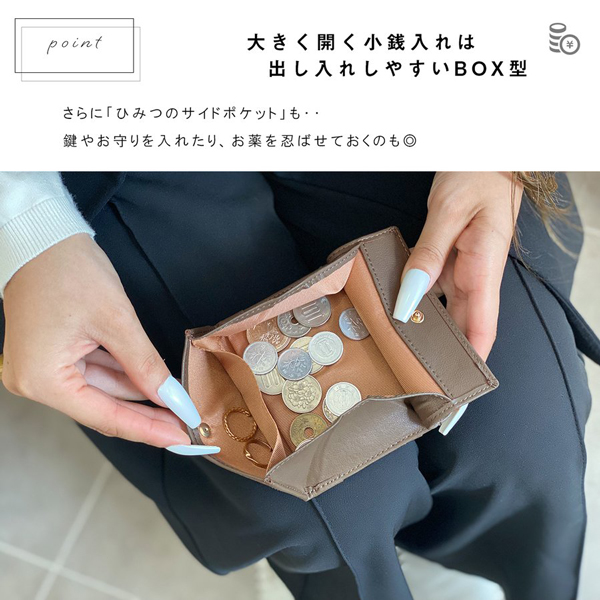 大きく開く小銭入れは、出し入れしやすいBOX型。