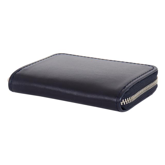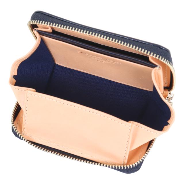 日本有数の革産地である兵庫県姫路市で完成までに5年を費やし、仕上げられた藍染めレザー。使い込む程により艶が増していきます。内装の白ヌメレザーはイタリア製のヌメ革を使用。オイルをしっかり含み、使い込む程に飴色に変化していきます。ラウンドファスナータイプの二つ折り財布にBOXタイプの小銭入れで非常にスマートに使い回せます。