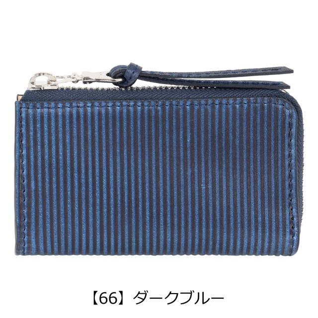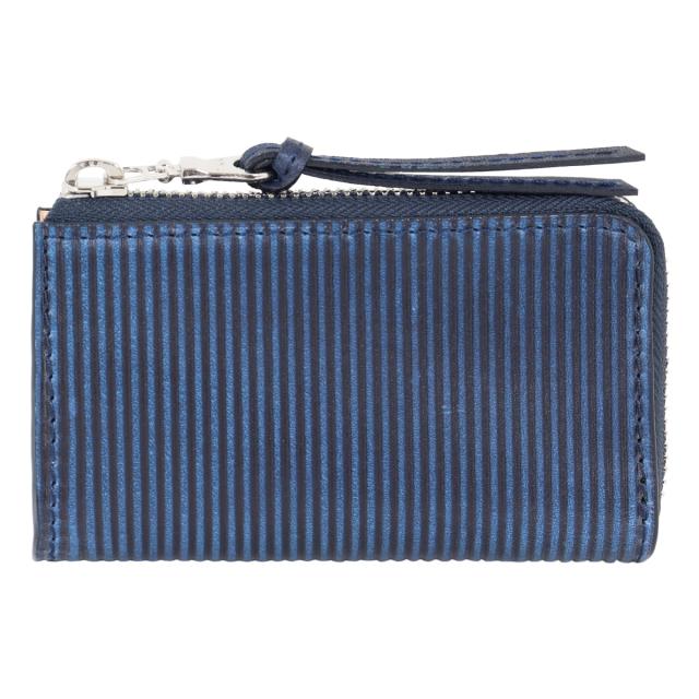 牛革藍染め加工×ストライプ型押し加工。ストライプの型押しを施し、弱めの削りを施すことで、あたたかみのある風合いを生み出しました。ほどよい濃淡の陰影が美しく、スッキリと引き締まったシャープな雰囲気に仕上げています。L字式開閉で開閉しやすくスマートキー専用ホルダーもあり非常に使い回しがしやすいアイテムとなっております。内側は明るい白ヌメカラーのすることで、メリハリのあるデザインに仕上げています。
