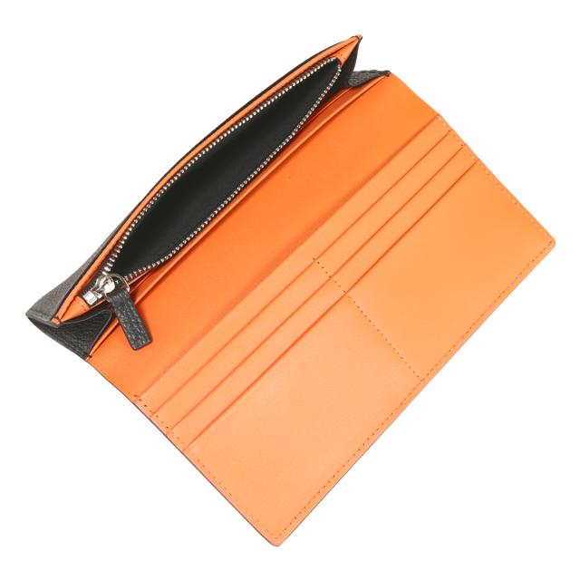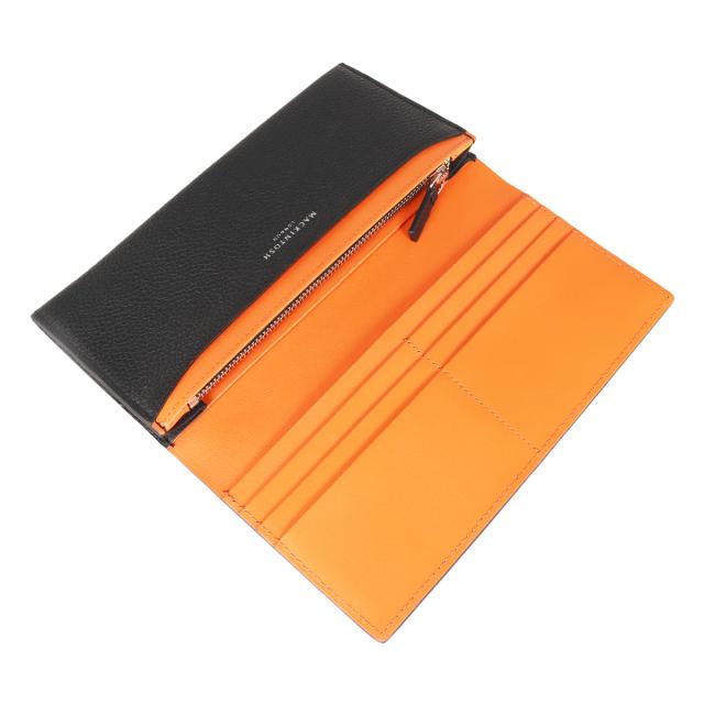 ビジネスにも適したスタイリッシュな外観英国風のオーセンティックな逸品を輩出し続けるMACKINTOSH LONDON。こちらはシンプルでベーシックなシリーズ『MEDAL』のスタイリッシュな長財布。深みのあるシュリンク型押しレザーにメダル形状のロゴプレートがさりげなくエレガントさを加え、ビジネスシーンにも違和感なくお使いいただけます。本体はフラップタイプで大きく開き、一目で中身を見渡せます。フラットなシルエットながらも、紙幣、カード、小銭をすっきり仕分けられるスペックを装備。レシートやチケットの仕分けに丁度良いポケットも備わるので、常に整頓された内装を保つことができます。外側背面にもポケットを装備。すぐに取り出したいチケットやカードがある際には、こちらに収納しておくとスムーズに取り出せます。本体素材にはソフトな質感が心地良く手に馴染む牛革スムースを採用し、内装革は存在感のあるオレンジの配色で統一しています。表面のシュリンク型押しは大人の印象を引き立たせるだけでなく、傷が目立ちにくいメリットも。外側のヘリは総コバ塗りとなっており、スッキリとした外観に仕上がりました。