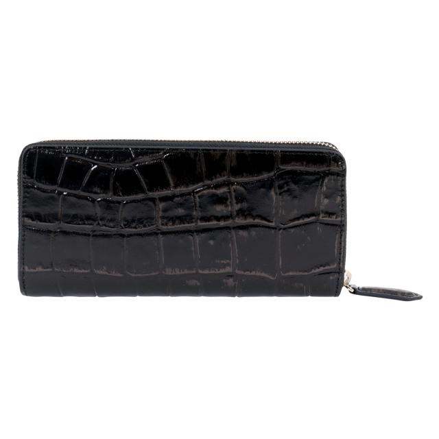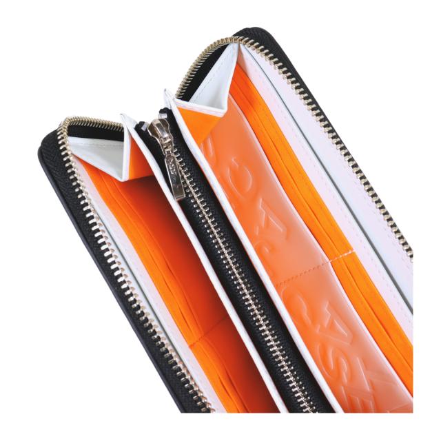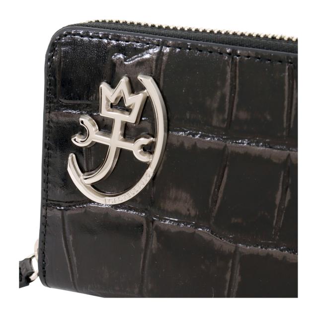POPなカステルバジャックとは一味違う、ダンディな男性が派手に持つ小物シリーズ。本体素材には、タンニンでしっかりと鞣されたコシのある牛革を使用。そこにメタル箔を貼り、クロコの型押しを施し、色を吹き付け、その色を拭き取ることで、ビンテージ物のような深みのある生地に仕上げています。内装カラーはモノトーンのカラーコンビ。CASTELBAJACの文字が散りばめられた型押しがポイント。