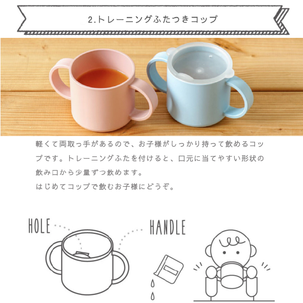 蓋の小さな穴から飲み物が少しずつ出てきて、コップの練習が出来る、トレーニングふた付きコップ。