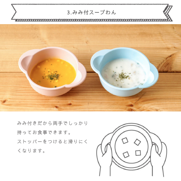 和食の時には、みみを両手でしっかり持ってお食事が出来る、みみ付きスープわん。