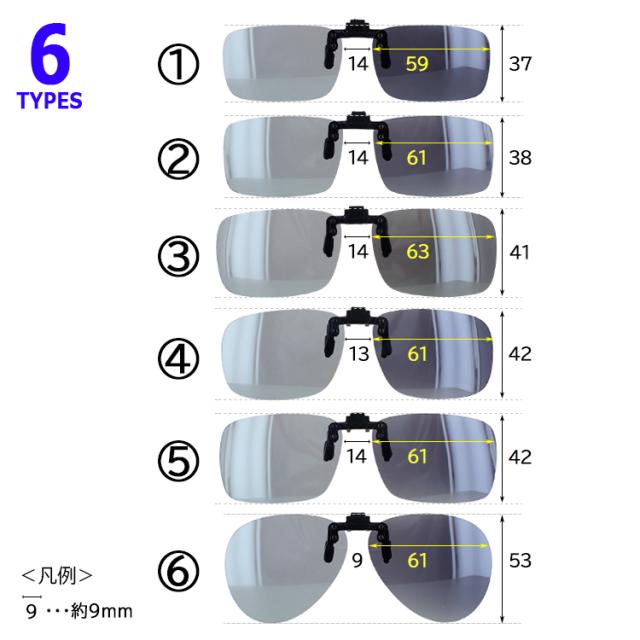 | ●種類 1、2、3、4、5、6の6タイプ ●カラー レンズカラー(全 タイプ共通) グレー調光偏光 金具カラー(全タイプ共通) ブラックマット | ●素材 レンズ:プラスチック(調光偏光) 金具:メタル合金 ●仕様 跳ね上げ クリップタイプ ●可視光線透過率 調光前40%−調光後10% |