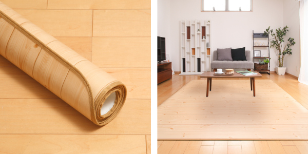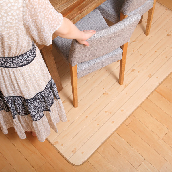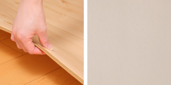 表面は少し弾力があるので、椅子を引くときの擦り傷や物を落とした時の床のへこみ、ペットのひっかき傷から大事な床材を守ります。傷つけにくく耐久性もあるので、傷つけたくない床のお部屋に最適なラグです。
