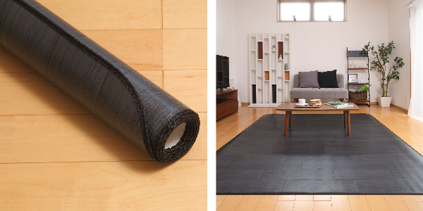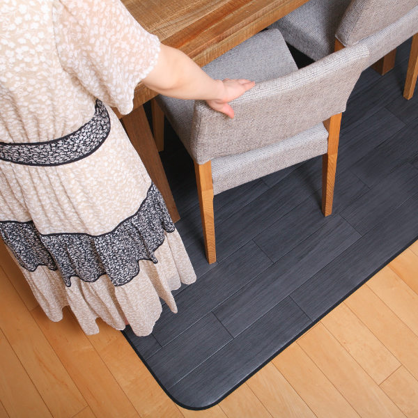 表面は少し弾力があるので、椅子を引くときの擦り傷や物を落とした時の床のへこみ、ペットのひっかき傷から大事な床材を守ります。傷つけにくく耐久性もあるので、傷つけたくない床のお部屋に最適なラグです。
