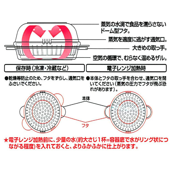 電子レンジ加熱時に本体とザルの間を空気が循環し、まんべんなく加熱します。加熱前に少量の水(約大さじ1杯)を入れておくと、よりふかふかになります。蒸気を適度に逃がす通気口も付いています。