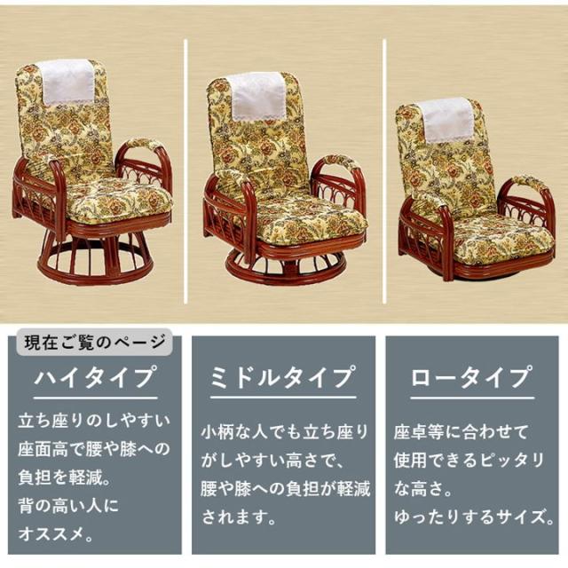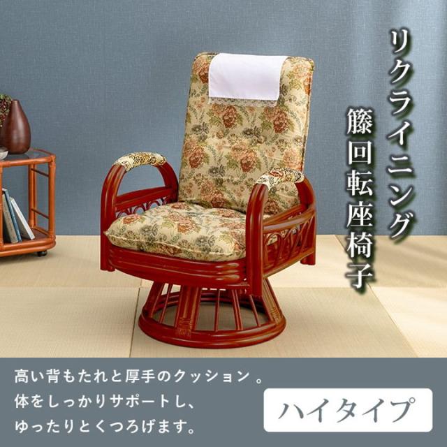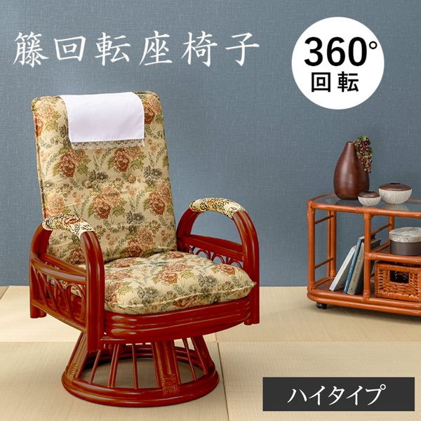 回転座椅子 高座椅子 肘掛け付き ハイバック ハイタイプ おしゃれ 籐 ラタン製 高齢者 3段階リクライニング 360度回転