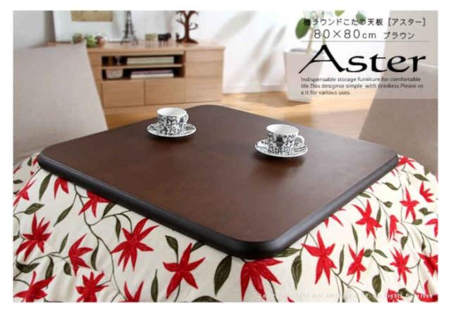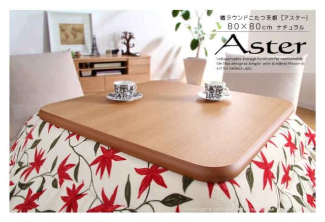 楢ラウンドこたつ天板 〔アスター〕 80×80cmです。カラーバリエーションは、ナチュラル[JAN:4580261480163/型番:11100291na]、ブラウン[JAN:4580261480170/型番:11100291br]です。古くなった天板を新品に!こたつ天板のみを手軽に交換。角の丸い優しい印象のラウンドデザイン。