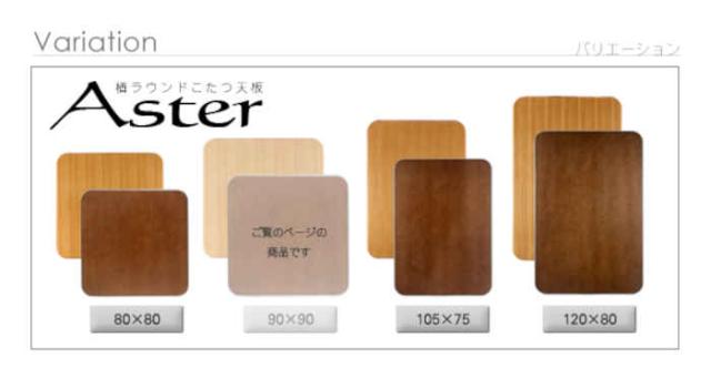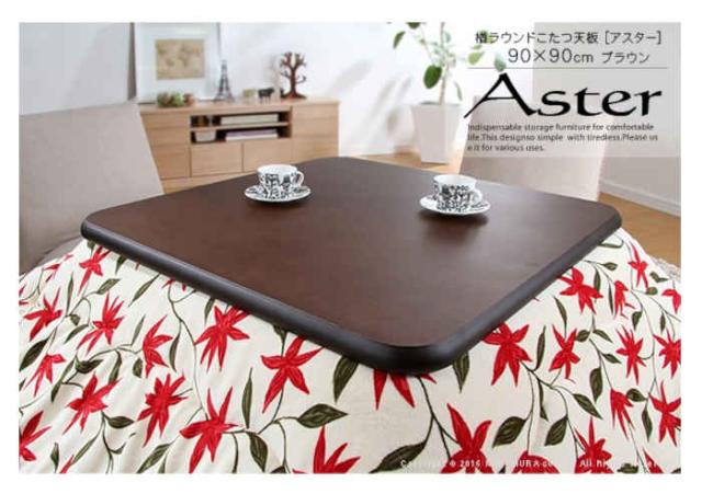楢ラウンドこたつ天板 〔アスター〕 90×90cmです。カラーバリエーションは、ナチュラル[JAN:4580261480187/型番:11100293na]、ブラウン[JAN:4580261480194/型番:11100293br]です。古くなった天板を新品に!こたつ天板のみを手軽に交換。角の丸い優しい印象のラウンドデザイン。