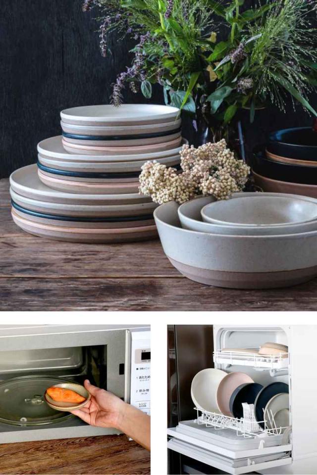 プレートの裏面は突起がなく平らになっているため、コンパクトに重ねられます。縁の立ち上がりは、食器洗いの際に指がかかりやすく、ソースや少し汁気のある料理にも対応できます。食器洗い乾燥機、電子レンジに対応しているので、温め直しや毎日のお手入れもラクラクです。