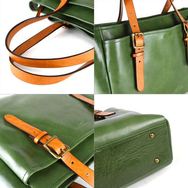 ハンドル部分には、本体のバケッタレザーとは異なる質感のスムースレザーが使用されております。本体のバケッタレザーもしっかりした厚みと強度があるのですが、より極厚で繊維の詰まったスムースレザーを使用することで、更なる耐久性を持たせました。また素材、カラーに変化をつけることによって、重厚になりがちな本格レザーのバッグに、カジュアル感をプラスしました。姫路のタンナーが作る国内トップクラスの品質のレザーをご堪能いただけます。